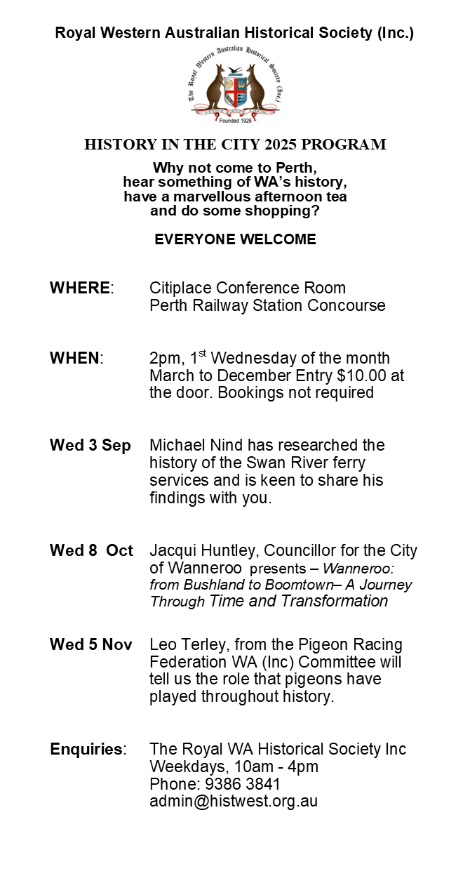 The Society aims to foster interest in and enjoyment of history and to promote the research, writing and publication about all aspects of Western Australian history. Some of the ways it does this is by hosting monthly research presentations, Meetings and talks, popular talks, History in the City, and conducting guided tours and events to places of historic interest both in the Perth Metropolitan area and in regions beyond. The annual program of these activities is published every January in the Society’s Calendar. All members receive a copy of this program.